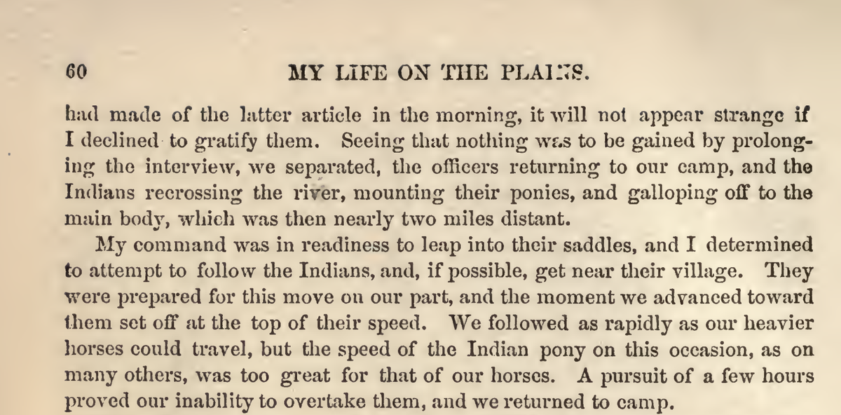 Обычная манера начать общение с отрядом, о враждебности которого известно, либо она предполагается, состоит в том, чтобы сблизиться с ними, двигаясь по зигзагу или по окружности. Переводчик проделал это сигнализирующее действие, и вскоре на него был получен ответ, - небольшая группа Индейцев, отделившись от основных сил, приблизилась к нас на расстояние слышимости крика (англ. within hailing distance). Была достигнута договорённость, что я, в воспровождении шестт других офицеров, выеду на берег реки к точке, находившейся примерно на равном расстоянии и от нашего лагеря, и от места, где [после нападения на нас] собрались Индейцы (прим. перев.: такие места оговаривались и, наверно, и сейчас, с поправкой на изменившиеся условия, оговариваются заранее, вроде у Кастера здесь тоже где-то есть про похожее планирование действий самих американских войск), и там с нами встретится равная по численности группа основных вождей противника. В качестве предосторожности против возможных коварных нарушений договорённости (прим. перев.: у Кастера в одно слово - "против "предательства", но моей разложенной влиянием Индейцев натуре претит такое топорно осуждающее определение ;)), я распорядился о том, чтобы бо́льшая часть моей команды держалась наготове,и условился с офицером, которому было вверено временное командование, о том, что призывом на помощь, если она вдруг понадобится, будет звук горна.