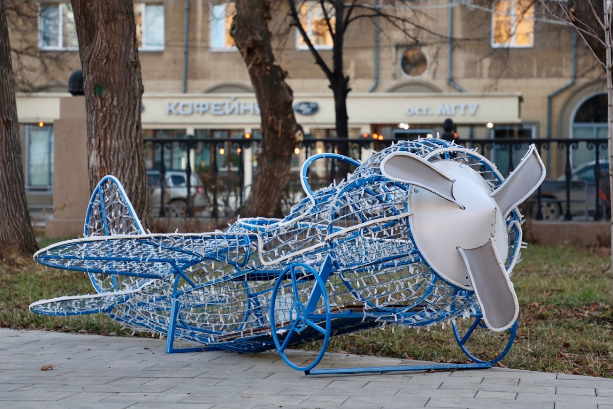 В Магнитогорске началась подготовка к Новому году. Городские улицы, скверы и парки постепенно украшаются к празднику. В сквере Металлургов уже установили светодиодные фигуры — воздушный шар, рождественские фонари и сказочный самолет. У входа гостей встречает большая ель, украшенная золотыми шарами.