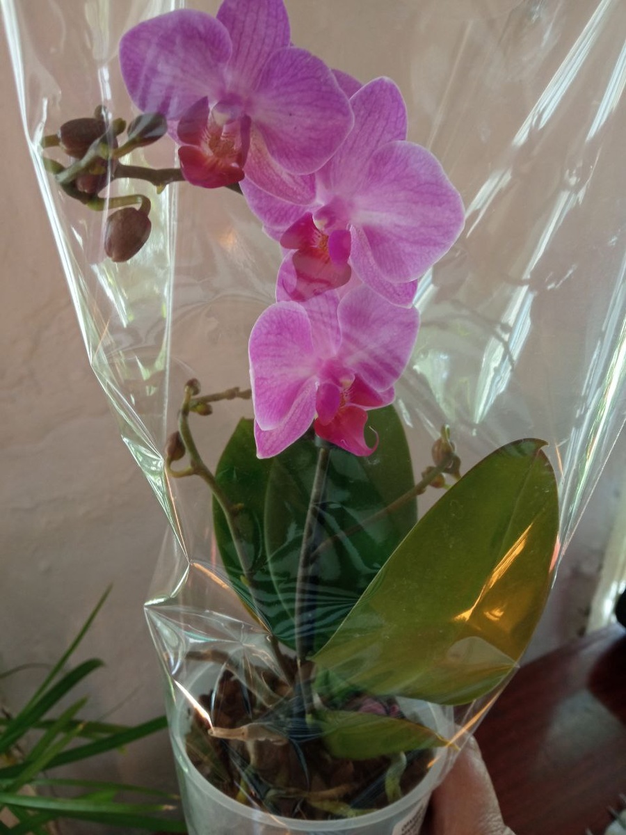 Здравствуйте.🌿 В моей коллекции растений есть одна орхидея. Почему одна? Просто чтобы закрыть для себя этот вопрос: орхидея есть и точка. И больше мне не надо. Я не фанат этих растений. Хотя в последнее время с интересом поглядываю в сторону других видов: цимбидиум, камбрия, мильтония и драгоценная орхидея. Пока приобретать не планирую, но кто знает... Немного отвлеклась. Орхидею я приобрела почти полтора года назад в "Лемана про". Зашла посмотреть комнатные растения и засмотрелась на орхидеи. Поняла, что мне просто жизненно необходима одна из них. Ходила вокруг них больше часа. Пересмотрела все, что были. И наконец выбрала ту самую, единственную и неповторимую. Корни были хорошие, два цветоноса. Сохранилось единственное фото. Здесь она еще в упаковке, но уже дома. И только дома, тщательно разглядывая свою покупку, я увидела, что шейка у орхидеи черная. Зная, что при покупке обязательно надо обращать внимание именно на этот момент, я этого не сделала. Тем не менее, орхидею я не тро