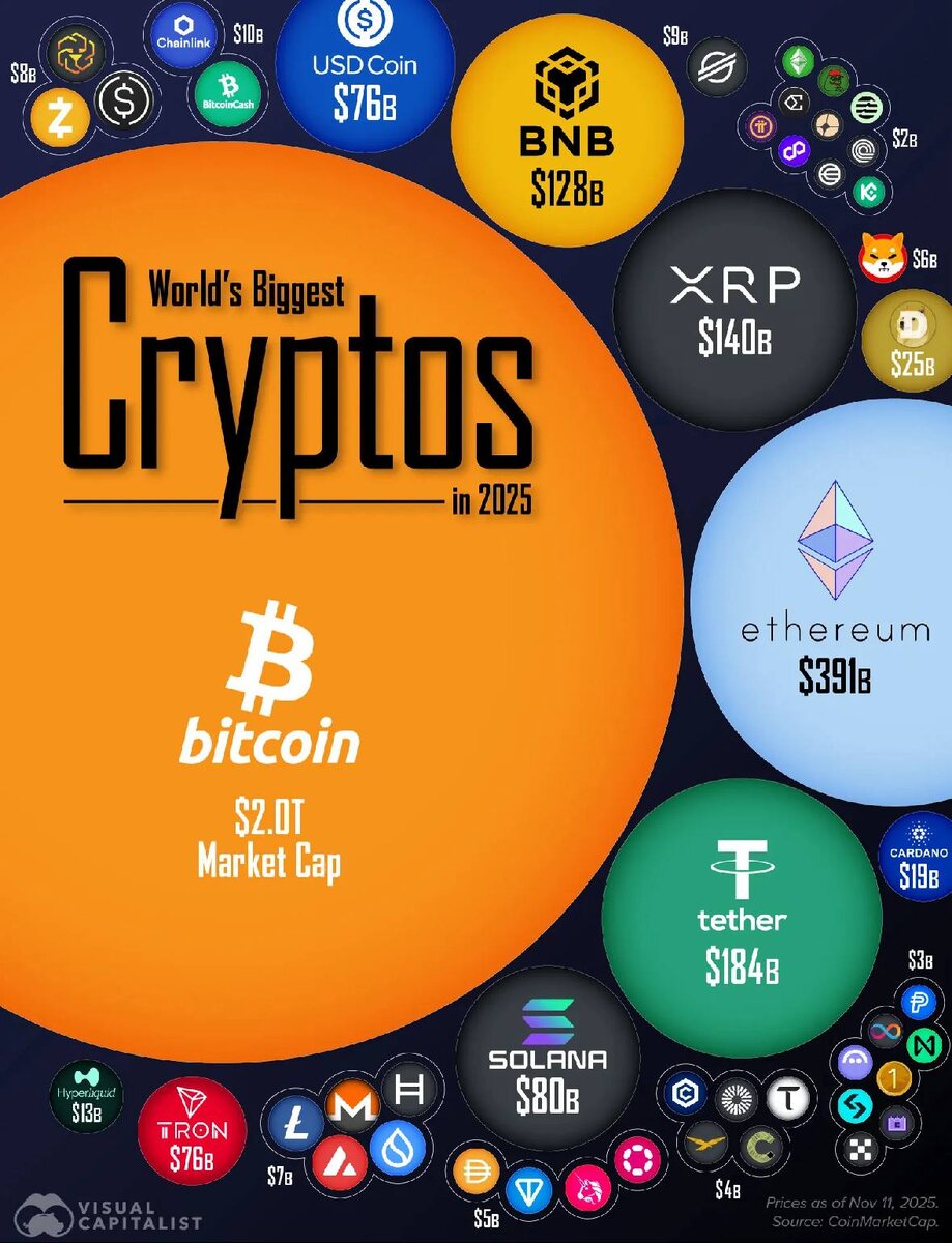 📌 Коротко про крипторынок 2025: кто здесь главный Если убрать эмоции и очередные «альтсезоны», картинка простая: рынок снова сосредоточен вокруг нескольких гигантов. 🔸 Биткоин - абсолютный монополист. $2 трлн капитализации - это половина всего крипторынка. Все разговоры про «биткоин устарел» как-то теряют вес, когда он по капитализации больше любой биржи, банка и половины стран. 🔸 Эфир держит второе место - $391 млрд. Не идеален, тормозит, комсы кусаются, но всё равно остаётся инфраструктурным слоем №1. Если сравнивать - это как «интернет протоколов» в крипте. 🔸 Стейблкоины укрепили позиции. USDT ($184B) и USDC ($76B) - фактически новые цифровые «доллары для всего мира». Объёмы переводов по ним давно обгоняют Visa и Mastercard, и это уже не хайп, а новая реальность. 🔸 Solana - $80B. Слишком живая, чтобы списывать, слишком волатильная, чтобы расслабляться. Но факт: она в топе. 🔸 XRP - $140B. Хейтеры хейтят, но капитализация говорит сама за себя - корпорации и банки продолж