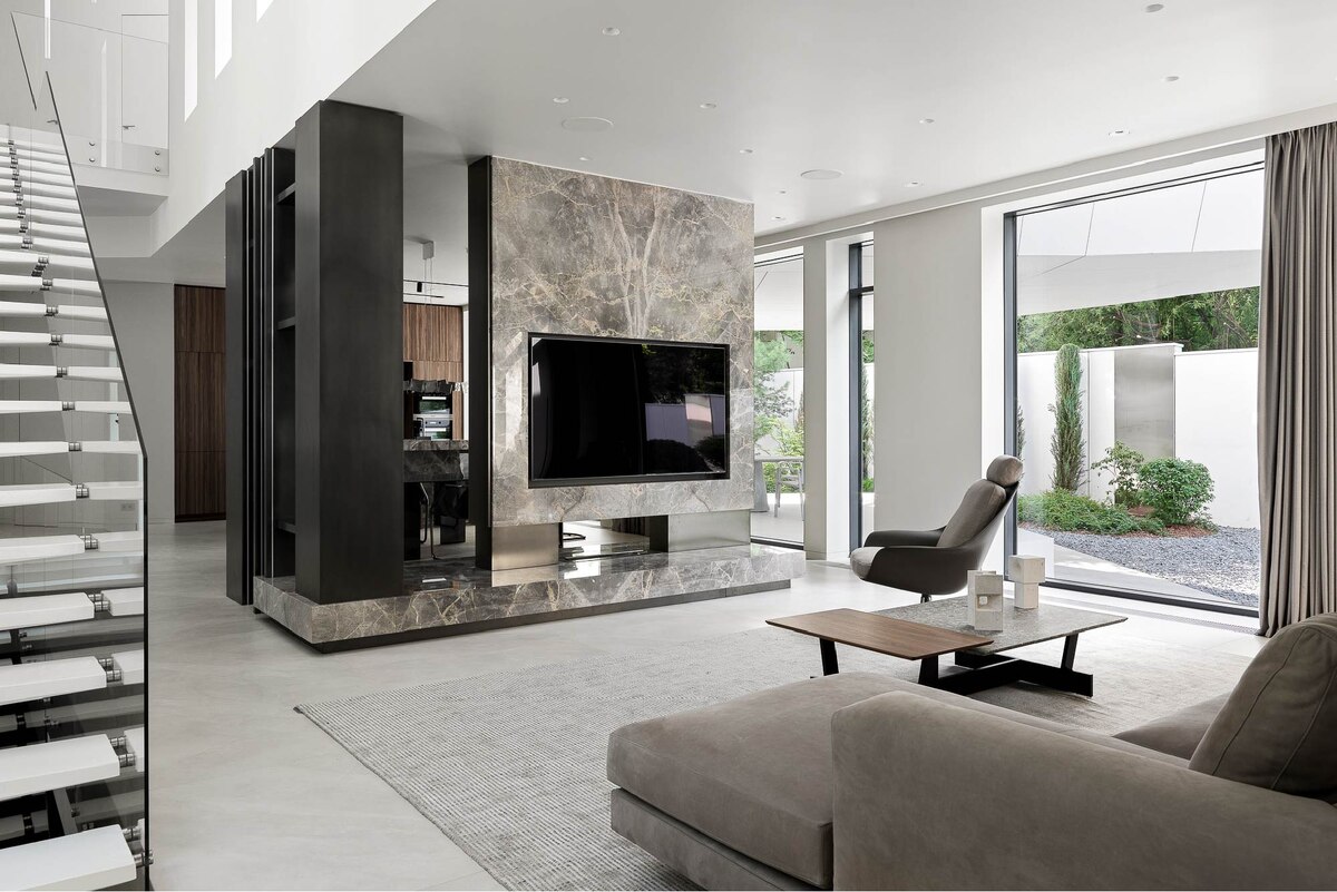 Планировка продумана так, чтобы в каждом блоке было комфортно в повседневной жизни: просторная гостиная с камином, кухня-столовая с выходом на участок, приватные спальни, рабочая зона, пространство для хобби и отдельный спа-блок. Дом воспринимается цельно, с плавными переходами между функциями и мягкой интеграцией света.