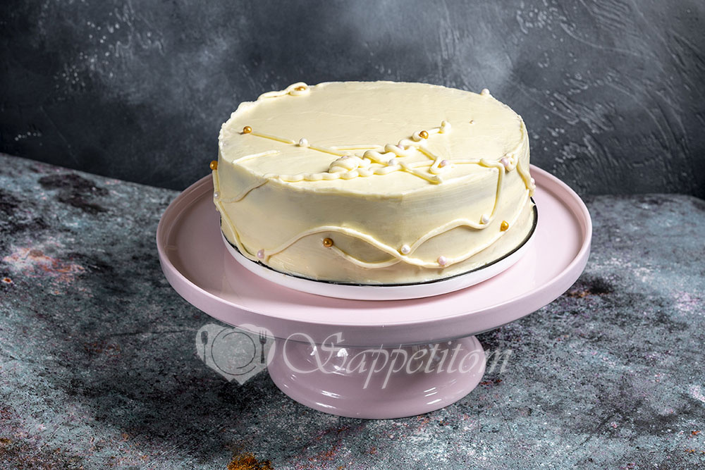 Перекладываем крем в кулинарный мешок, отрезаем уголок и наносим поверх торта. Верх и бока торта разравниваем лопаткой.