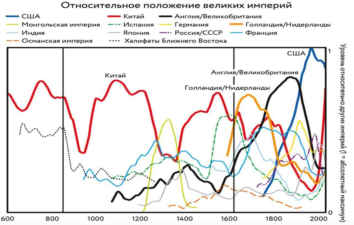 ПОЧЕМУ ИМПЕРИИ ПАДАЮТ? 500 ЛЕТ ИСТОРИИ НА ОДНОМ ГРАФИКЕ" Перед тобой цикл восхождения и падения империй Рэй Далио (создатель хедж-фонда сумма активов $160 млрд) потратил годы, чтобы найти закономерность: почему Голландия пала? Почему Британия потеряла мировое превосходство? И главное — почему США сейчас на том же пути. ЧТО ТЫ ВИДИШЬ: Это график из книги “Принципы изменения мирового порядка” — анализ могущества 11 великих империй за 500 лет (1500-2000) Каждая линия это комбинированный индекс из 8 конкретных измеримых факторов. Самое ключевое - история циклична Сейчас США медленно падают. Китай быстро растет Рэй Далио выделил 8 факторов Ставь 🔥 — в следующем посте разберу каждый фактор Тимофей Нутрихин