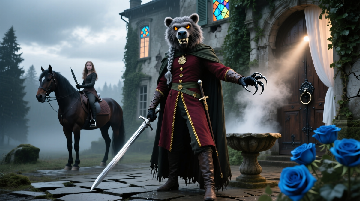 Оно было огромным, человекообразным, но с медвежьей головой, увенчанной косматой гривой. Глаза горели красным огнем, а из оскаленной пасти торчали кривые клыки. Одето оно было в поношенную, но дорогую одежду, что делало его вид еще более нелепым и пугающим.