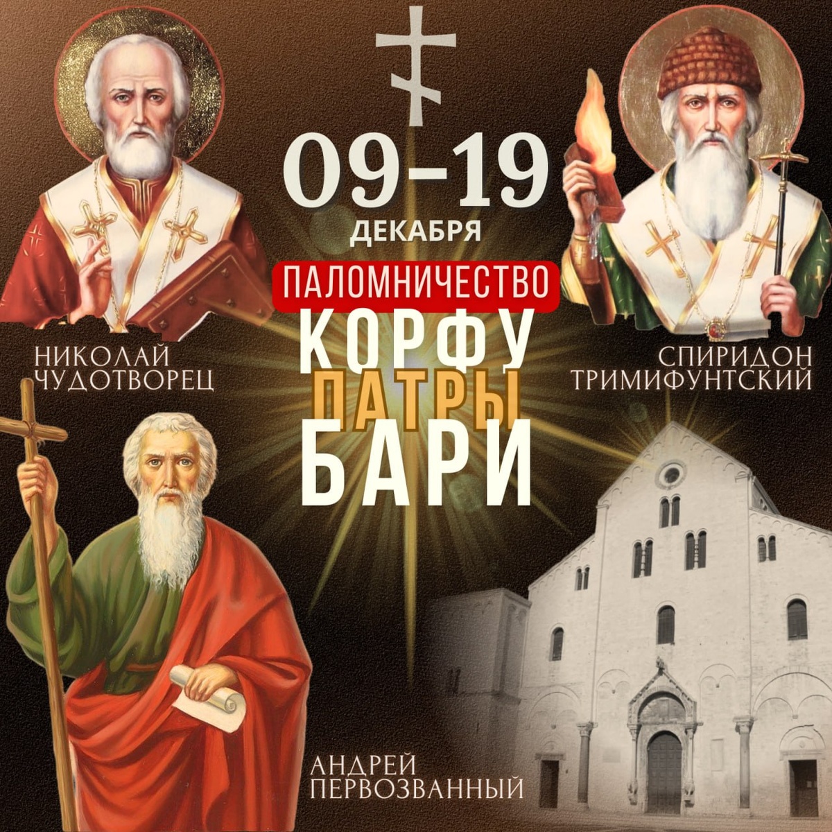 🌏 ПАЛОМНИЧЕСТВО КОРФУ — ПАТРЫ — БАРИ Десять молитв святителям Николаю и Спиридону о помощи в делах, в работе и защите в судах ⬅️ назад Дорогие братья и сестры! В ближайшие дни мы совершаем заключительное паломничество этого года, приуроченное к праздникам двух святителей: Николая и Спиридона. А поскольку в эти дни также совершается память апостола Андрея, то помимо Корфу и Бари мы посетим и город Патры. 📌 КОРФУ 12 декабря (по греческому календарю) на острове Корфу проходят праздничные торжества в честь святителя Спиридона. Это главный праздник святого совершаемый в главном месте его почитания. В эти дни весь остров собирается на молитву, а тысячи паломников свидетельствуют о благодатной помощи святителя. 📌 ПАТРЫ 13 декабря Церковь празднует память Андрея Первозванного — одного из самых апостолов. В праздничный день мы посетим Патры, город его мученической кончины: здесь находятся честные мощи и крест, на котором святой принял смерть. 📌 БАРИ С 14 по 19 декабря мы будем в Бари, ч