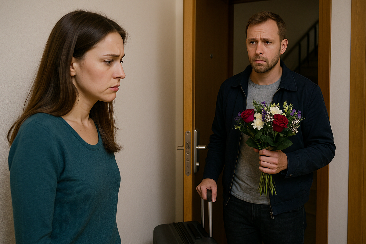 Он стоял с цветами. Букет был какой-то слишком правильный — как в кино. Лицо у него было незнакомое: похудевшее, напряжённое. И глаза… глаза были не победителя, который ушёл “к нормальной”. Глаза были человека, который где-то ударился о реальность.