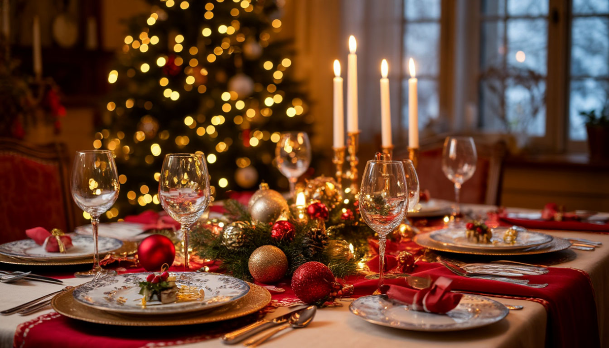- Расставляю тарелки, бокалы, свечи, мишуру. Главный трюк — разная высота: подставьте под некоторые блюда перевернутые пиалы или коробочки, накиньте красивую ткань — стол сразу оживет.