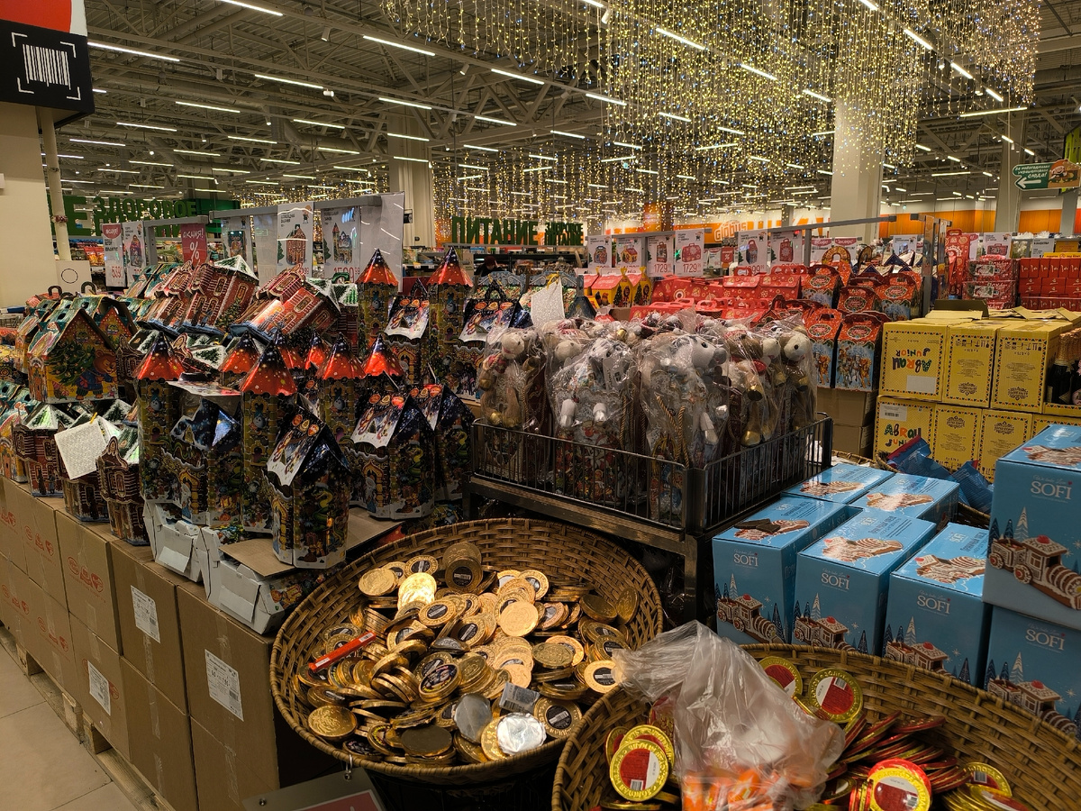 Впервые за несколько месяцев проспала 8 часов не просыпаясь ни разу. Выспалась. Проснулась в начале восьмого без будильника. Настроение прекрасное! Жаль только, что тело подводит и в новый день уже не вприпрыжку, а просто шагом. Выпила чашку горячей воды с лимоном. На завтрак была уха (поварешка) и пшеничные хлопья на воде (пара столовых ложек). После завтрака отправились в "Глобус" докупить конфет для благотворительных подарков. Уже завершаем формирование подарков и скоро повезём батюшке в деревенскую школу. В "Глобусе" уже вовсю работает новогодний базар. В детстве обнаружить такую шоколадную фигурку в новогоднем подарке было настоящим счастьем. А сейчас радуются дети таким вкусняшкам? Или больше бабушки с дедушками, которые покупают эту красоту своим любимым внучаткам? Очень большая коробка со сладостями. 1999 рублей. Подарок в красивой жестяной коробке со Щелкунчиком 1499 рублей. Вот прямо очень красивая подарочная коробка. Большая. В такой коробке потом можно хранит