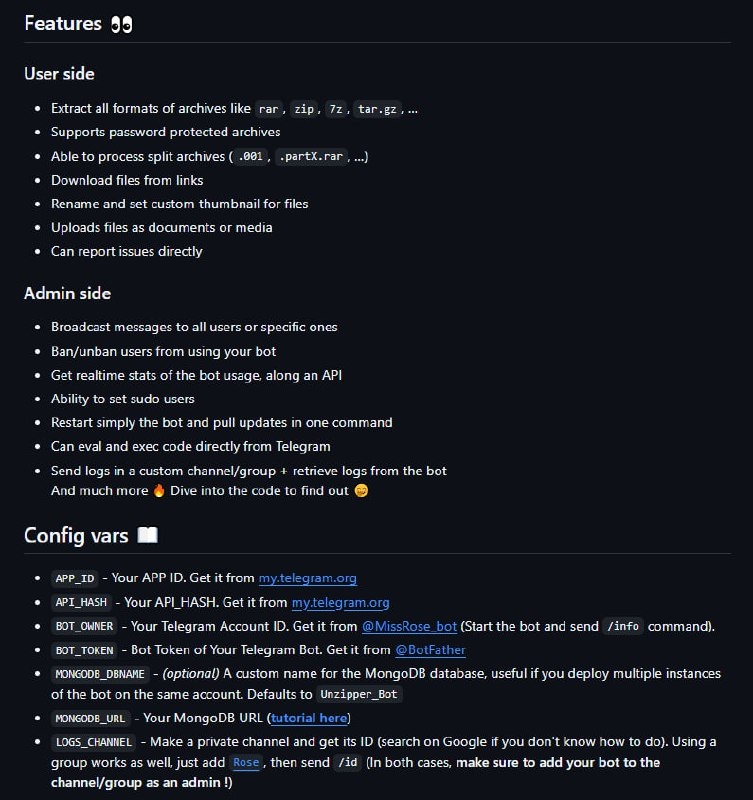 🤖 unzip-bot — это проект телеграм-бота, который умеет распаковывать архивы прямо в Telegram. 📌 Основные особенности: 🔵Распаковка архивов разных форматов: zip, rar, 7z, tar.gz и др. 🔵Поддержка защищённых паролем архивов 🔵Работа со сплит-архивами 🔵Загрузка архива по прямой ссылке и отправка распакованных файлов в чат 🔵Переименование файлов и установка собственных иконок для медиа 🔵Рассылка сообщений всем пользователям или отдельным 🔵Бан/разбан пользователей 🔵Получение статистики использования бота 📱 Репозиторий ➡️Справочник Программиста. Подписаться