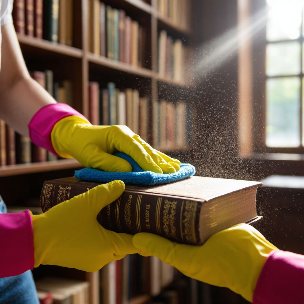- Как избежать ошибки: Никаких мокрых тряпок у закрытых полок! Влажная уборка — только для открытых, пустых поверхностей полки. Для блеска можно использовать спрей для антистатической уборки (как «Мистер Пропер» для мебели), но распыляйте его на салфетку, а не на книги!