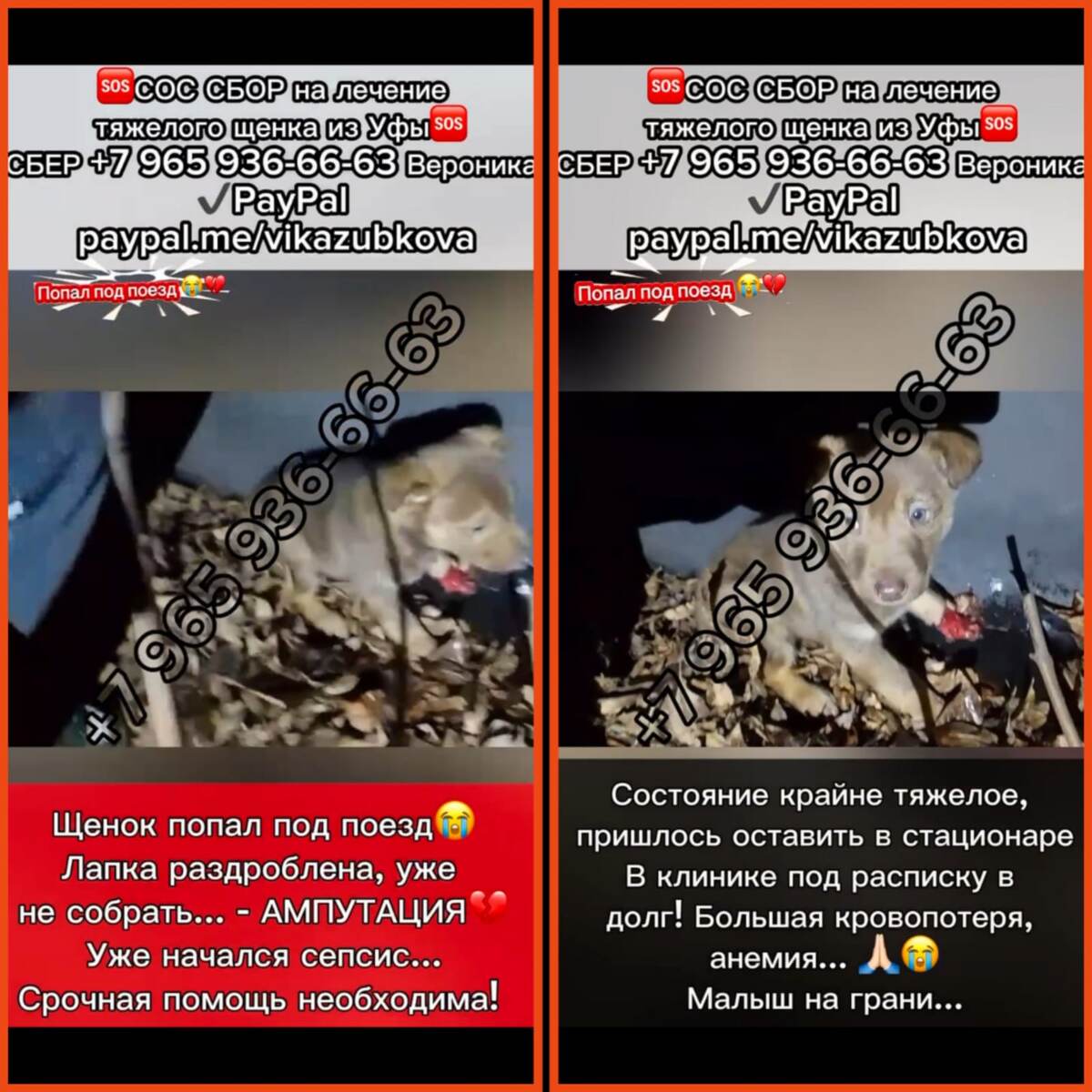 Щенок попал под поезд😭 Лапка раздроблена, уже не собрать… - АМПУТАЦИЯ🥺😢 🆘 УФА, ВСЯ РОССИЯ!!! Уже начался сепсис… Срочная помощь необходима! Состояние крайне тяжелое, пришлось оставить в стационаре В клинике под расписку в долг! Большая кровопотеря, анемия… 🙏🏻😭 Малыш на грани… Волонтёры были в полном шоке от масштаба трагедии, думали, судя по ногтям, что лапа цела... Но, к сожалению, восстанавливать там нечего..предстоит ампутация.. Пока приходили в себя, люди уже начали помогать🥹 Искренне благодарим всех, кто уже откликнулся: на текущую дату уже оплачена сумма 15.000₽! Это невероятно! Спасибище!!!🙏🏼 Однако, впереди огромные финансовые затраты… • Долг по рассрочке за первые процедуры, анализы и стационар: 7.770 рублей. • Стоимость ампутации: 30.000-35.000₽ • Стационар после операции (критически важен!): примерно 13.000 рублей. ⚡️К СБОРУ 55.770₽⚡️ Пожалуйста, помогите малышу💔...он только начал жить, и вот такая ТРАГЕДИЯ!😢 ⚡ Помочь можно из ЛЮБОЙ С