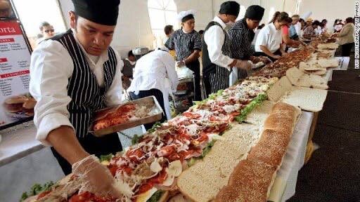 Бутерброд размером с мечту: 865 килограммов чистого счастья Вы когда-нибудь, стоя в очереди за скромным хот-догом, задумывались, а каков предел человеческой гастрономической дерзости? Где та грань, за которой обычный перекус превращается в эпическое событие, достойное летописей? Что ж, пока мы размышляли, в одном солнечном уголке мира взяли и ответили на этот вопрос. И ответ этот весит 865 килограммов и простирается на 70 метров. Дамы и господа, встречайте — самый большой сэндвич в истории человечества! Рекорд Гиннесса или вызов вселенскому голоду? 🥖 Сразу отбросим скучные цифры и представим картину. Семьдесят метров — это, на минуточку, длина взрослого синего кита или высота 23-этажного дома! Только вместо этажей и окон здесь — аппетитные слои начинки, а вместо китовой кожи — хрустящая, ароматная корочка свежеиспеченного багета. Этот хлебный левиафан был создан не в тайной лаборатории сумасшедшего повара, а на шумном городском фестивале, где целая армия пекарей, мясников и сыродел