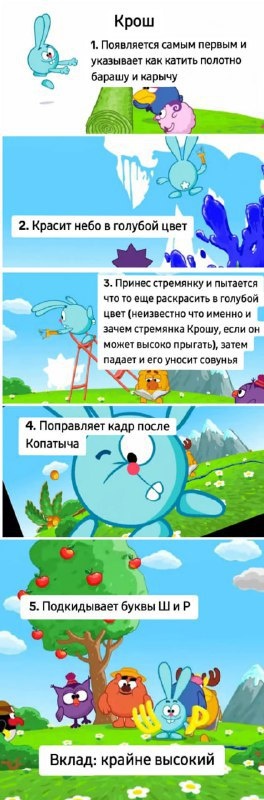 В ТикТок появился захватывающий рейтинг, посвящённый полезности персонажей из Смешариков в заставке. Чем больше персонаж способствовал созданию их мира, тем выше его значимость в списке. В тройку лидеров вошли: Совунья, Крош, Нюша и Бараш. Меньше всего пользы принёс Лосяш — его роль ограничивалась лишь чтением. Постмейкер - автоматическое ведение канала 🤖 Анимация | СhatGPT-4 | Помощь с резюме