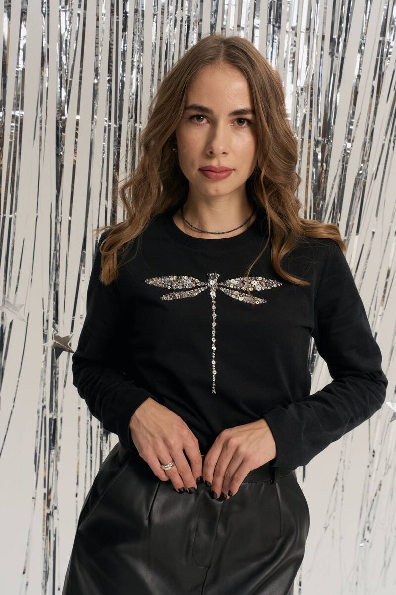 Лонгслив черный с вышивкой стрекоза COCOSSIMO, 8490 руб. Ультрамягкий лонг с peach-эффектом – идеал, чтобы носить в качестве первого слоя под жакет, кардиган или толстовку.