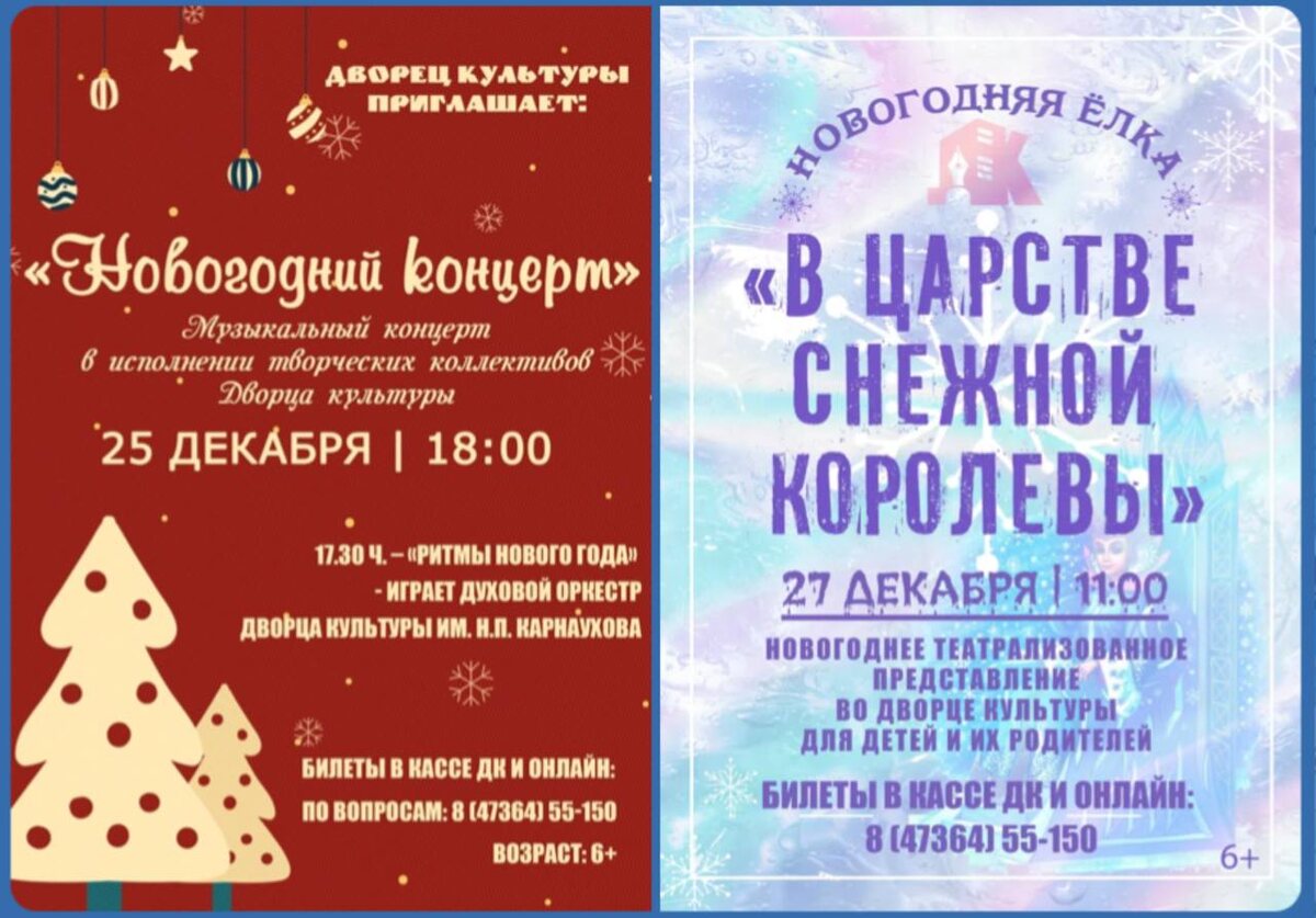 Праздничная программа на 25 декабря: 17:30 — «Ритмы нового года» Выступление духового оркестра имени Н. П. Карнаухова. Яркое открытие праздничных вечеров — погрузитесь в атмосферу Нового года с виртуозной игрой музыкантов! 18:00 — «Новогодний концерт» Музыкальное представление с участием творческих коллективов Дворца культуры. Вас ждут: любимые новогодние мелодии; весёлые музыкальные и сценические номера; неповторимая праздничная атмосфера. Информация о мероприятии: Место: Дворец культуры (площадь Ленина, 1). Стоимость билетов: 350 рублей. Онлайн‑продажа: vk.cc/cRZ8oY. Возрастное ограничение: 6+. Праздничная программа на 27 декабря: 11:00 — «В царстве Снежной Королевы» Волшебное театрализованное представление для детей и родителей. Отправляйтесь в ледяное королевство, где вас ждут: захватывающие приключения; встречи со сказочными персонажами; настоящие чудеса! Информация о мероприятии: Место: Дворец культуры (площадь Ленина, 1). Стоимость билетов: 600 рублей. Онлайн‑продажа: vk.cc
