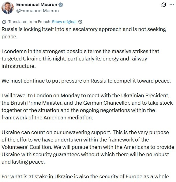 Macron to rush to London on Monday for emergency meeting with Zelensky, Starmer and Merz The gang will 'take stock of situation' 'Russia is not seeking peace' he says while announcing a meeting to talk about peace talks... with Russia