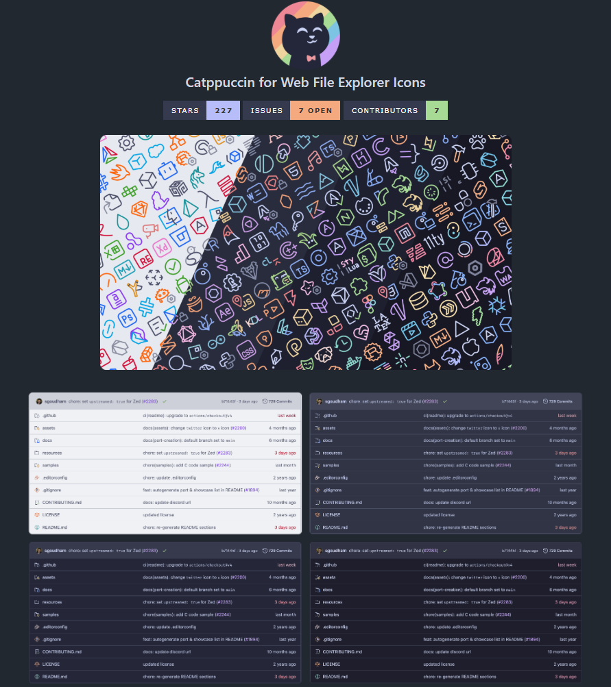Catppuccin File Explorer Icons — это расширение для браузеров (Chrome, Firefox, Microsoft Edge), которое обогащает внешний вид файловых обозревателей на популярных веб-платформах уникальными иконками в мягкой пастельной тематике Catppuccin. Расширение использует успокаивающие пастельные иконки и применяет их к файловым обозревателям на следующих сайтах/платформах: * GitHub * Gitlab * Gitea * Forgejo * Bitbucket * Tangled * Поддержка популярных платформ: Расширение разработано специально для файловых обозревателей на ключевых платформах для работы с кодом и репозиториями. * Простота настройки: Пользователи могут легко настраивать внешний вид иконок, их ассоциации и параметры (включая монохромные иконки и опции для специфических папок (specificFolders)) через интуитивно понятное всплывающее окно расширения. * Различные цветовые схемы (Flavors): Пользователь может выбрать один из цветовых "вкусов" Catppuccin для иконок: Latte, Frappé, Macchiato или Mocha. * Гибкая активация на доменах: До