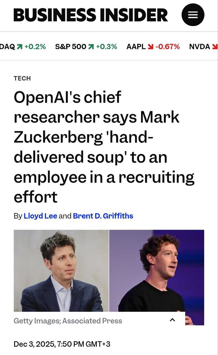 Если вы в этом году были хорошим мальчиком/девочкой классным программистом, то к вам на Новый год придет Дедушка Цукерберг с чеком на $100 млн и кастрюлькой наваристого супа И это реальная история: Марк лично приезжал к разработчику из OpenAI и кормил того домашним супом. Так за столом и дымящейся похлебкой в 2025 году хантят лучших и ведут переговоры по офферу. Хотите в команду классного специалиста — учитесь варить суп. «Альянс Цифровых Лидеров в стройке» в MAX