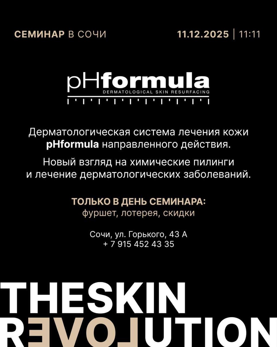 Уважаемые коллеги, 💥впервые в Сочи, презентация 🇪🇸испанского бренда пилинговых систем PHFORMULA Инновационные пилинги нового поколения представлены более чем в 40 странах мира. Мероприятие состоится : 📅 Дата: 11 декабря 🕒 Время: 11:11 📍 Место проведения: г. Сочи, ул. Горького, 43 А ( SPOT coworking & gallery) ТЕМА: ДЕРМАТОЛОГИЧЕСКАЯ СИСТЕМА ЛЕЧЕНИЯ КОЖИ PHFORMULA НАПРАВЛЕННОГО ДЕЙСТВИЯ. НОВЫЙ ВЗГДЯД НА ХИМИЧЕСКИЕ ПИЛИНГИ И ЛЕЧЕНИЕ ДЕРМАТОЛОГИЧЕСКИХ ЗАБОЛЕВАНИЙ. 🎓Спикер: эксперт-тренер бренда Камалова Ольга, врач-комбустиолог, косметолог-эстетист, сертифицированный тренер pHformula. 📋ПРОГРАММА мероприятия: * 🫶знакомство с основными линейками бренда * 🤲🏻 мастер-класс с демонстрацией процедур * фуршет и лоторея * 🔖 скидка на первую закупку ❗️Предварительная регистрация обязательна 📲Запись по телефону: +7 915 452•43•35 Кристина