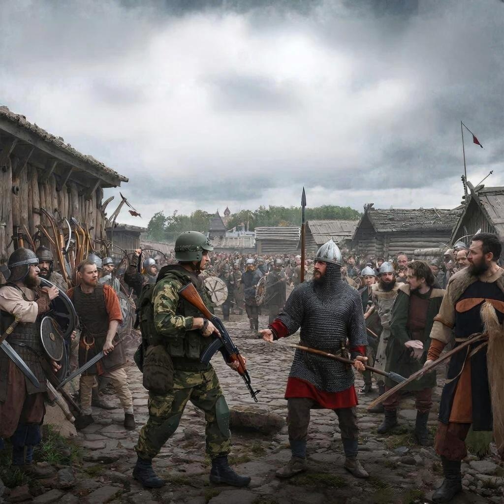 Фантастический рассказ Древний Новгород, IX век. Город кипит жизнью, ремесленники работают над созданием оружия и доспехов, торговцы ведут оживленную торговлю, а дружина князя готовится к очередному походу. Но никто не подозревает, что скоро этот мир изменится навсегда. Группа русских спецназовцев из будущего случайно попадает в прошлое благодаря экспериментальному устройству временной телепортации. Они оказываются посреди боя, где новгородская дружина сражается с врагами. Спецназовцы быстро понимают, что их современное оружие и технологии могут изменить ход истории. Они решают помочь новгородцам победить врагов, используя свою боевую технику. Их машины и оружие поражают воображение местных жителей, вызывая страх и уважение одновременно. Вместе с дружиной они одерживают победу, спасая город от уничтожения. Однако их вмешательство вызывает цепочку событий, которые меняют будущее. Вернувшись домой, спецназовцы обнаруживают, что их мир изменился. История пошла другим путем, и теперь они