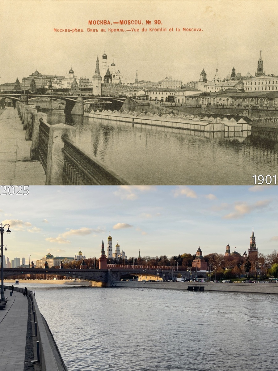 Вид на Кремль с Раушской набережной. В кадре можно увидеть старый Москворецкий мост, застройку Васильевского спуска, торговые ряды перед стенами Китай-города, а также старую ограду и спуски к реке Репост из источника