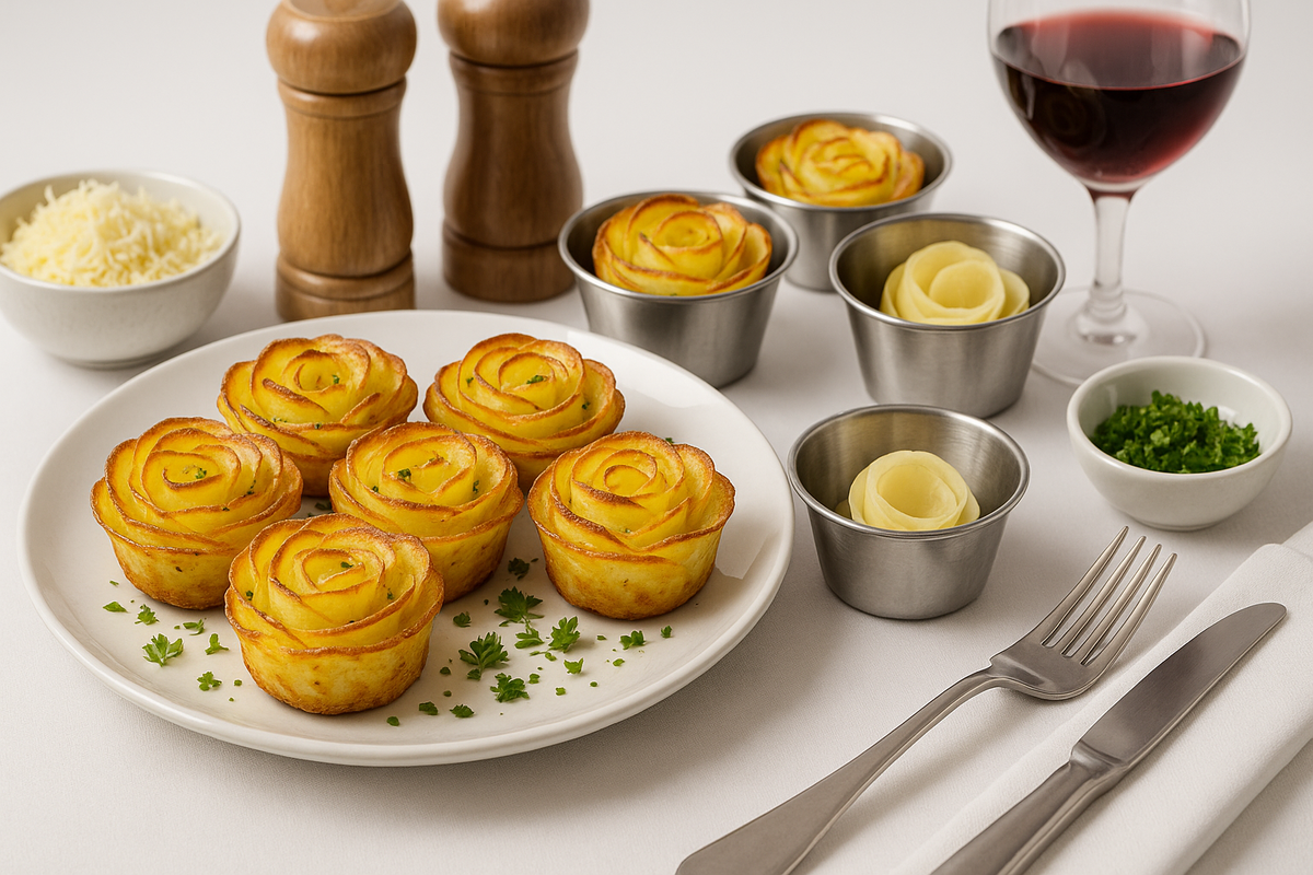 Хрустящие снаружи, нежные внутри, аромат чеснока и сыра. Готовятся просто, выглядят эффектно. Отличный вариант к мясу, рыбе или как самостоятельная закуска. Хорошо держат форму, можно заранее подготовить и запечь перед подачей. Согласись, отрондые запечённые картофельные розочки с чесночным сыром внутри звучат уже интригующе. Но когда видишь их на столе в золотистой корочке, уложенные на тарелку, как маленькие закусочные цветы, невозможно не попробовать. Рецепт Картофель очищаю и нарезаю тонкими пластинами. Лучше всего пользоваться овощечисткой, чтобы ломтики были одинаковой толщины. Беру мягкий сливочный сыр, добавляю в него измельчённый чеснок и немного соли. Формирую маленькие шарики начинки. В металлические формочки для маффинов выкладываю по кругу пластинки картофеля, слегка внахлёст. В центр прячу шарик сыра. Сверху закрываю ещё одним слоем картофеля. Сбрызгиваю растительным маслом. Запекаю при 190 градусах примерно 35 минут до красивой золотистой корочки. Даю немного остыть, за