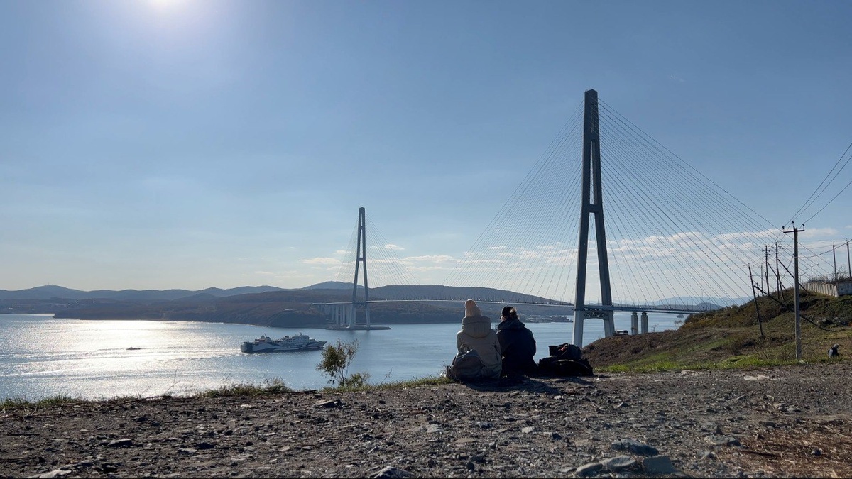На фото мы сидим на фоне Русского моста во Владивостоке и едим завертоны (так на Дальнем Востоке называют шаурму). Не скажу, что насладился вкусом, так как несколько раз бегал и ставил штатив для съемки разных ракурсов. Но зато какие там кадры😎