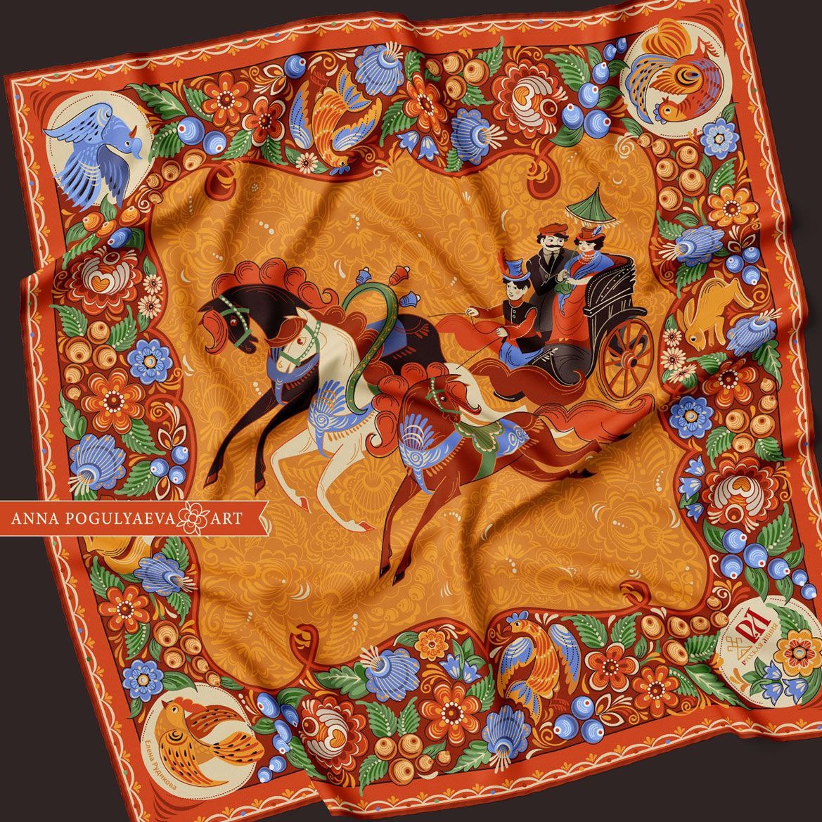 Тройка мчится, тройка скачет, Вьется пыль из-под копыт, Колокольчик, заливаясь, Упоительно звенит. Моя иллюстрация «Русская тройка» для шелкового платка по мотивам городецкой росписи, создана специально для бренда Елены Рудиковой «Русская Линия». #Городец #иллюстрация #принтдляплатка #векторнаяиллюстрация @AnnaPogulyaeva_Art
