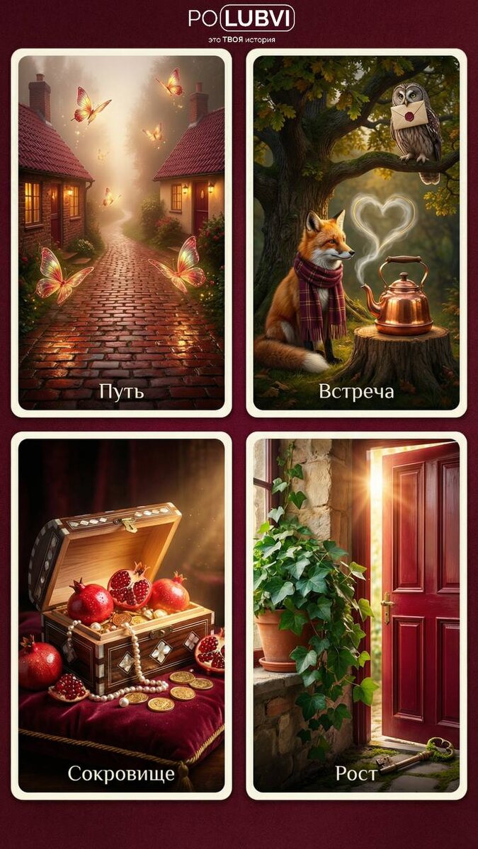 Каждый декабрь нас атакуют предсказания: что надеть, куда поехать, какую стрижку выбрать. Но следующий год — это не про тренды. Это про ваш личный сценарий. Тот, что пишется не звездами, а вашими решениями, встречами и тихими «да», которые вы говорите себе. Мы верим, что будущее чувствуется. Оно проявляется не в длинных текстах, а в образах, которые находят отклик где-то глубоко внутри. Поэтому мы создали четыре метафорические карты «Следующий год». Это не гадание. Это способ перевести внутренние ощущения в красивый визуальный язык. Каждая карта — сгусток смысла, настроения и потенциала. Того, что может стать вашей опорой, вдохновением или ключом к важному решению в 2026 году. Перед вами четыре образа. Путь. Встреча. Сокровище. Рост. Ваша задача — простая и мгновенная: выбрать одну. Ту, к которой потянулось внимание. Ту, что вызвала любопытство или лёгкое узнавание. А дальше — самое интересное. Мы расшифруем для вас язык этого образа. Расскажем, какой ресурс, какое состояние или возм