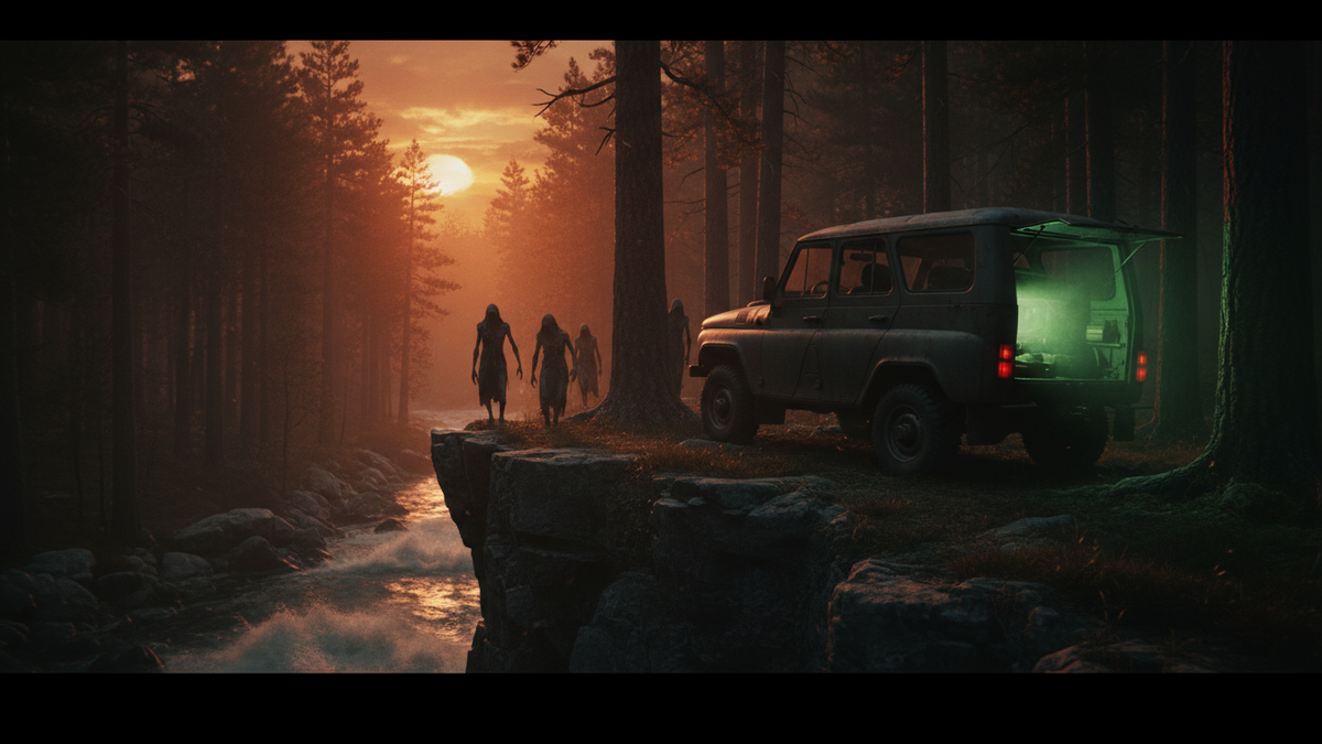 Старая «Нива» натужно ревела, прыгая по ухабам размытой лесной дороги. Солнце клонилось к закату, окрашивая вершины сосен в тревожные кроваво-оранжевые оттенки. За рулем сидел Александр, хмуро глядя на извилистую колею. Рядом, уткнувшись в потрепанную карту, ерзал младший брат Евгений. — Саня, тут должен быть съезд, — пробормотал он, водя пальцем по листу. — Дядя Володя говорил: «Когда увидите реку Белую — почти приехали». А мы уже час трясемся, а реки нет. — Увидим, — бросил Александр, не отрывая глаз от дороги. Ему не нравилось это место. Лес становился гуще, темнее, почти враждебным. Воздух был неподвижным и густым. Наконец, сквозь стволы пробился серебристый отблеск. Неширокая, но стремительная река Белая змеилась между крутыми берегами, поросшими мхом. До городка Арти оставалось двадцать километров, но день таял. — Тормози! — воскликнул Евгений. — Какая красота! Давай разомнем ноги, я уже устал. Александр остановил машину на полянке у обрыва. Тишина была почти осязаемой. Ни птиц,