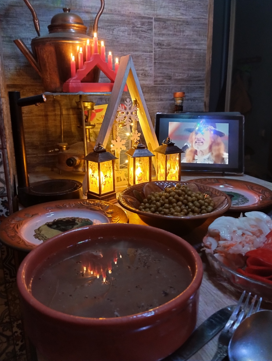 Мужское виденье ужина- гороховый суп с копчёностями, зелёный горошек с сосисками и колбасками. Прямо 90-е вспомнились