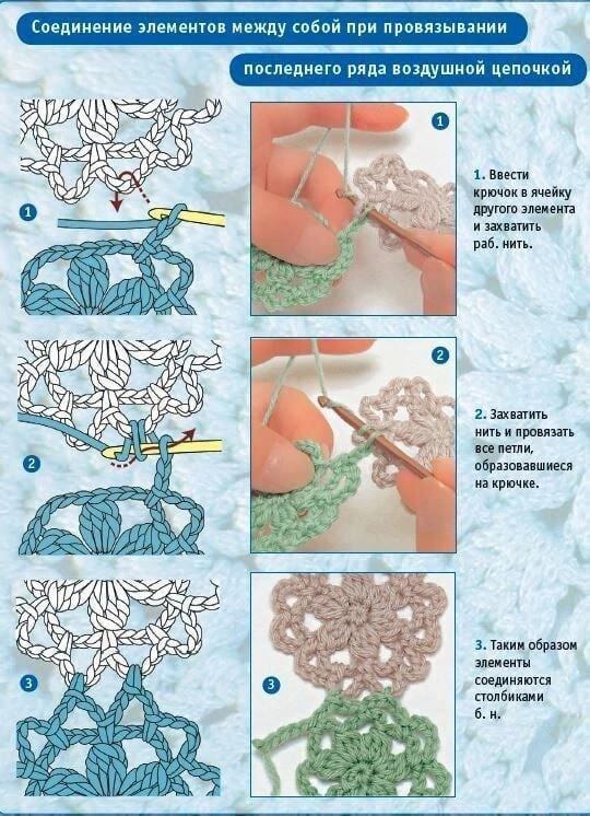 🔔 4 УРОК. Соединение мотивов. Урок смотри по ссылке🤩 https://vk.com/video-170019792_456240559 Ютуб: https://youtu.be/_u7LX52QfKU?si=AzQUX9x2rJai5La_ Существует несколько способов соединения различных мотивов. Выбор конкретного способа зависит от назначения изделия, желаемого внешнего вида, и, разумеется, от формы мотива. Многие мотивы можно соединять по-разному, все зависит от фантазии исполнителя, которая и формирует искомое кружевное полотно. Общее правило состоит в том, что соединение крючком должно производиться с лицевой стороны полотна обоих мотивов. Если производить соединение с изнанки, то можно добиться декоративного эффекта (при пэчворке, например). Если необходимо произвести плотную сборку мотивов (особенно треугольный, квадратных, шестиугольных), то их можно просто плотно сшить, либо соединить при провязывании последнего ряда каждого последующего мотива посредством провязывания стбн, либо соединительного столбика в арку воздушных петель, пико, группу столбиков с разн