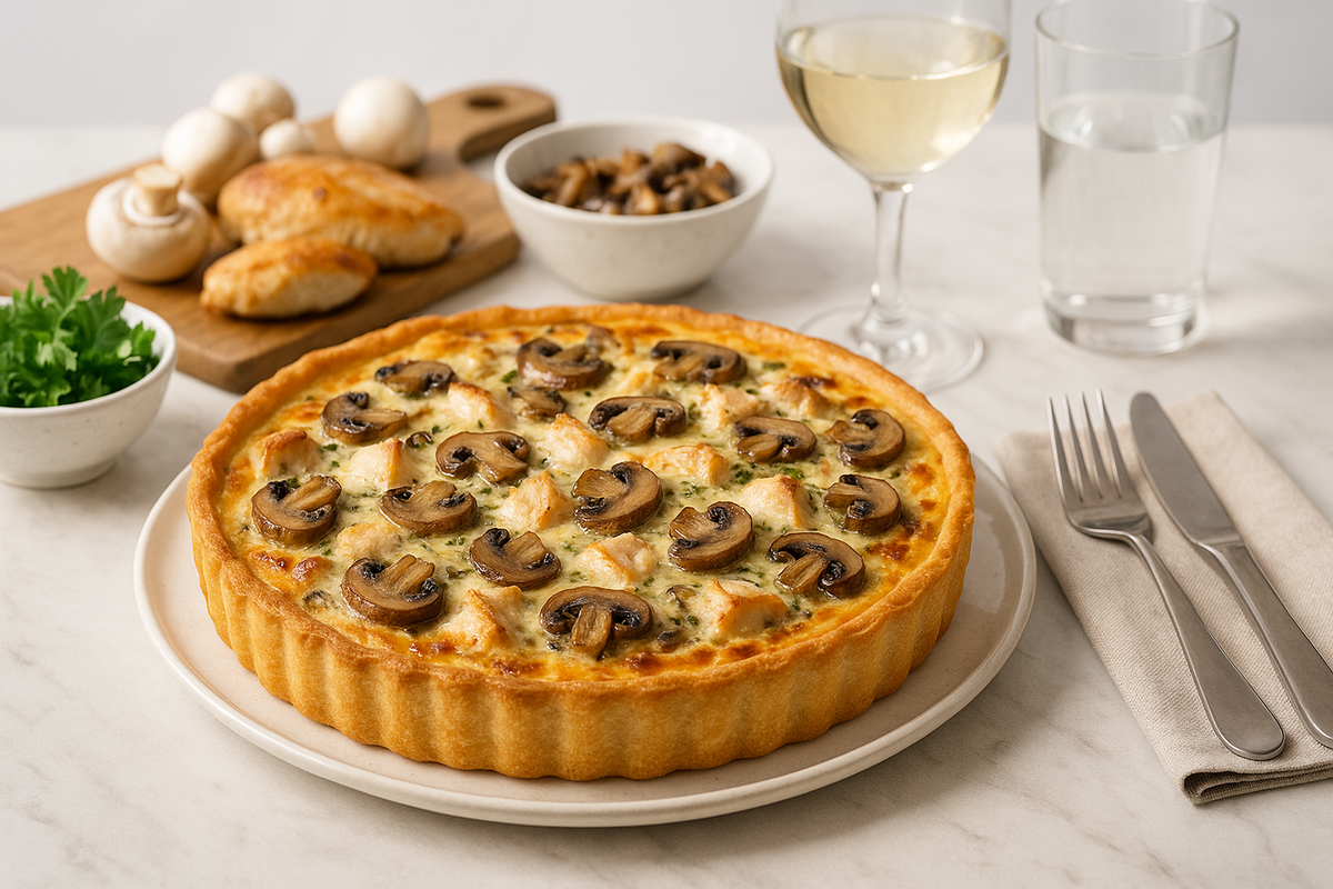 Моя подруга как-то сказала: «Если есть идеальная домашняя выпечка для гостей, то это киш». И я тогда впервые задумалась: почему он так цепляет? Хрустящее тесто, нежная начинка, сливочный вкус, тонкий аромат грибов. А главное — выглядит как ресторан, а делается у нас дома. Подача Идеально, когда кусок киша лежит на светлой тарелке, рядом веточка зелени и капля соуса, сверху золотистая корочка. Ничего лишнего, чистое удовольствие глазами. Что понадобится Для формы диаметром 24 см: Тесто: Мука 250 г Масло холодное 120 г Яйцо 1 Вода 2 ст. л. Начинка: Куриное филе 250 г Грибы шампиньоны 300 г Сливки 20% 200 мл Яйца 3 Сыр твердый 120 г Соль, перец Как готовить Масло быстро перетереть с мукой, добавить яйцо и воду. Собрать в шар, убрать в холодильник на 20 минут. Тонко раскатать, выложить в форму, сделать бортики. Проколоть вилкой. Выпекать 10 минут при 180°C. Курицу нарезать кубиком, обжарить до легкой румяности. Добавить грибы, дождаться пока выпарится влага. Яйца смешать со сливками,