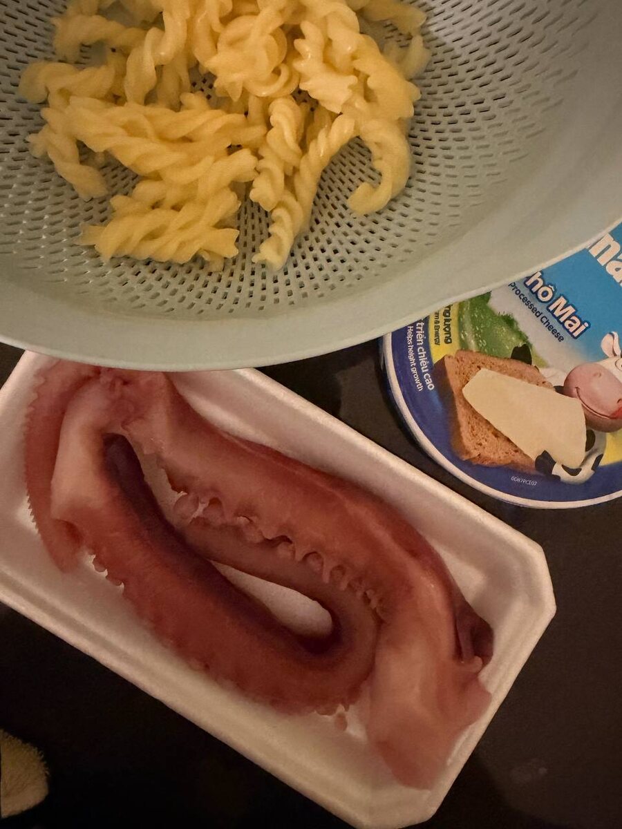 После телесно-ориентированной практики и двух дней созвонов в Школе жизни по-женски самое оно вкусный ужин: фузилли с щупальцами осьминога в