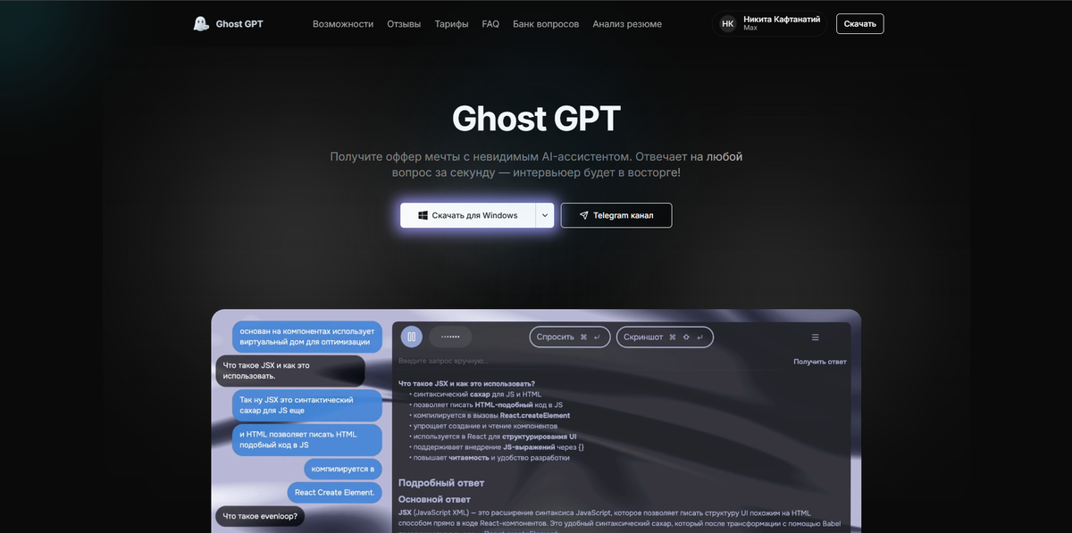 Один из главных страхов кандидатов — что рекрутер или инженер увидит, что на экране открыт какой-то бот и подсказчик. Ghost GPT решает это несколько иначе, чем «обычные» помощники: