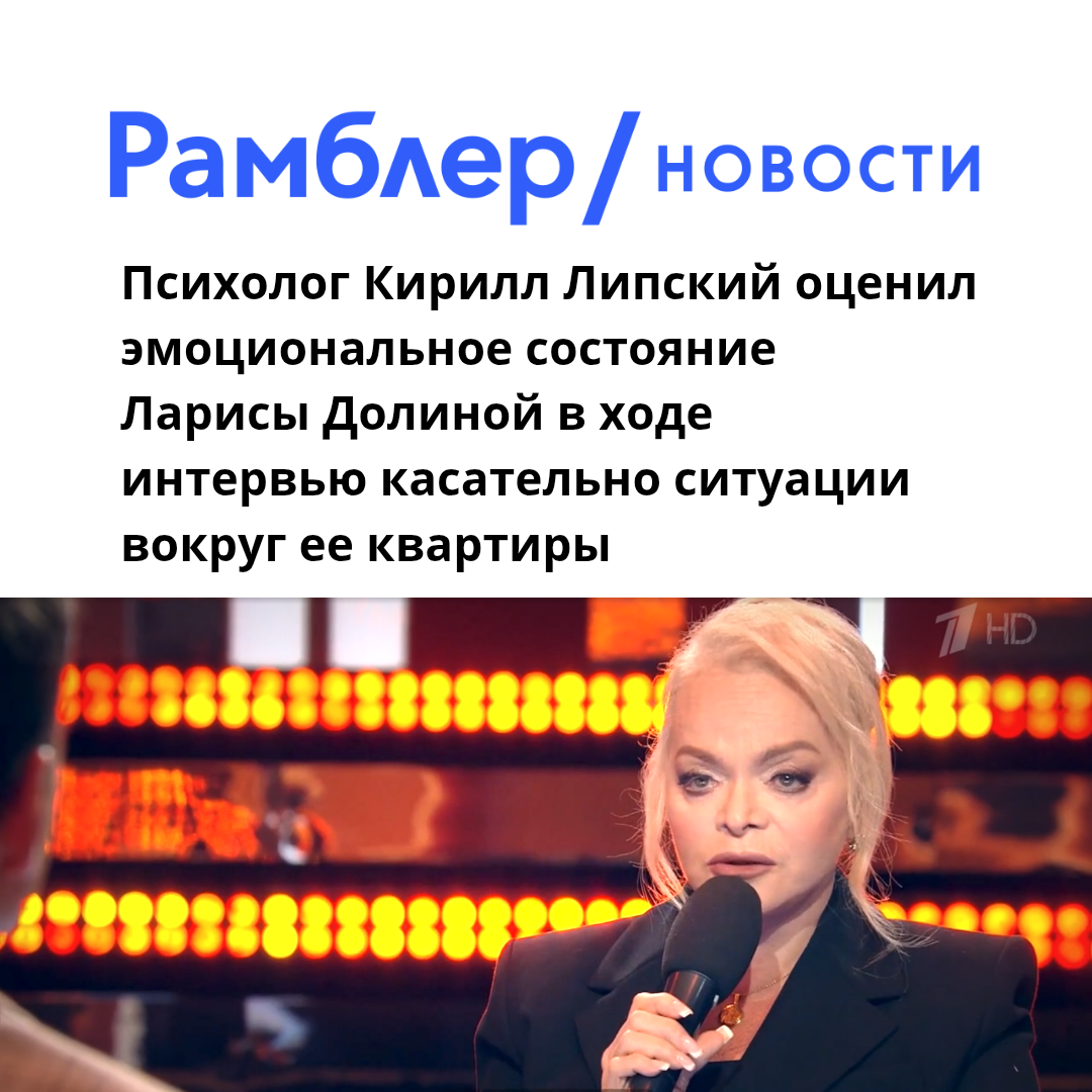 Сегодня в беседе с Рамблером (Rambler.ru), я оценил эмоциональное состояние певицы Ларисы Долиной касательно ситуации вокруг ее квартиры, основываясь на небольшом отрывке интервью, который еще днем опубликовал «Первый канал». Основываясь исключительно на том небольшом отрывке интервью Долиной, который уже опубликовал «Первый канал», можно отметить, что у певицы преобладает эмоциональное состояние в формате смеси гнева, подавленного возмущения и фрустрации. В глаза бросается высокий уровень напряжения певицы. Она демонстрирует не грусть или страх жертвы, а ярко выраженный гнев. Это видно по ее жесткой и сжатой мимике: сомкнутые губы, напряженные скулы, кожа вокруг рта складывается в складки, когда певица говорит ключевые слова, такие как «угрозы», «болезненно», «наивно» и так далее. Кроме того, ее гнев и возмущение отслеживаются по речевым паттернам. Это четкое, почти отрывистое произношение, акценты на ключевых словах. Я не вижу здесь речи человека, находящегося в спокойном состоян