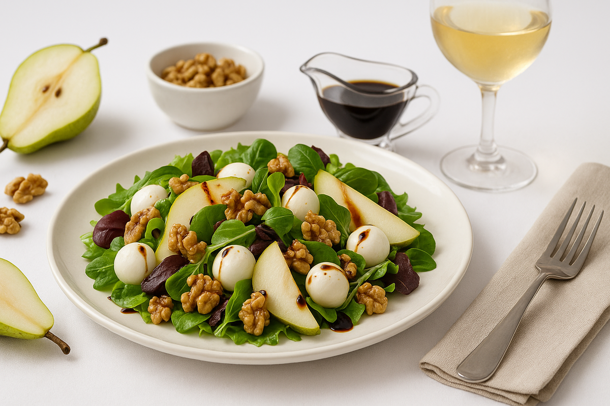 Нежная моцарелла, сладкая груша, лёгкая кислота бальзамика и хруст орехов. Идеальный салат для праздника и свидания на домашней кухне. Рецепт Количество порций: 2 Калорийность на 100 г: 98 ккал Белки 4.3 г Жиры 6.7 г Углеводы 5.9 г Ингредиенты: • Моцарелла мини 130 г • Груша 1 шт • Листья салата (микс) 60 г • Орехи грецкие 20 г • Бальзамический уксус 1 ч. л. • Оливковое масло 2 ч. л. • Мед 0.5 ч. л. • Щепотка свежемолотого перца Приготовление: Листья салата промываю и обсушиваю. Грушу нарезаю тонкими пластинами. Моцареллу разрываю руками не мельча, так она лучше держит текстуру. Орехи слегка подсушиваю на сухой сковороде, чтобы раскрыть аромат. Смешиваю в миске масло, бальзамик и мед до однородности. Выкладываю листья, сверху грушу, моцареллу и посыпаю орехами. Поливаю заправкой и даю салату постоять пару минут, чтобы вкусы раскрылись. Подача: Беру широкую плоскую тарелку, раскладываю ингредиенты слоями, оставляя красивый свободный фон. Контраст белой моцареллы и жёлтой гр