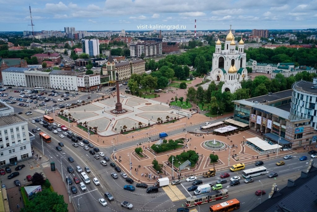 Площадь Победы Главная площадь Калининграда. В архитектурный комплекс площади входят: Храм Христа Спасителя, Часовня Петра и Февронии, а также Триумфальная колонна, которую венчает Орден Победы. На георгиевской ленте надпись: «Великой Победе посвящается 1941-1945». Площадь неоднократно меняла название. До 1930-х гг Площадь носила название Ганза платц, позже Адольф Гитлер Платц (осуждаем нацизм в любых его проявлениях). В довоенное время на территории, где сейчас располагаются Площадь Победы и ул. Профессора Баранова находились павильоны Восточно-Прусской Ярмарки. Частично здания сохранились, в том числе здание на пл. Победы, 1 - здание администрации Калининграда. В послевоенное время площадь Победы в Калининграде получила неофициальное название «Площадь трёх маршалов». Это связано с тем, что в первые годы после окончания войны на площади были установлены большие портреты трёх выдающихся военачальников. В 1958 году на площади установлен памятник В.И. Ленину, до этого времени здесь б