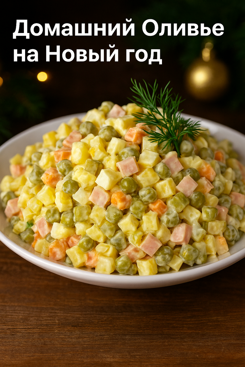 Вот рецепт домашнего новогоднего Оливье с калорийностью, указанной прямо в ингредиентах (в скобочках)и полным расчётом калорийности готового блюда и одной порции. Все цифры — средние, рассчитаны по стандартным продуктам. 🥒 Ингредиенты (с калорийностью каждого продукта) Картофель — 4 шт. / 400 г (308 ккал) Морковь — 2 шт. / 200 г (82 ккал) Яйца — 5 шт. / ~250 г (390 ккал) Огурцы солёные — 3–4 шт. / 200 г (26 ккал) Горошек консервированный — 1 банка / 200 г (138 ккал) Варёная колбаса «Докторская» — 300 г (690 ккал) Майонез 50–67% — 180 г (1188 ккал) Соль и перец — по вкусу (0 ккал) Укроп для подачи — по желанию (2–3 ккал) 👨🍳 Приготовление 1. Подготовьте овощи Отварите картофель и морковь в мундире. Остудите, очистите. 2. Яйца Сварите яйца вкрутую (10 минут), остудите, очистите. 3. Нарезка Все продукты режьте кубиками одинакового размера: картофель морковь яйца солёные огурцы колбасу 4. Горошек Слейте жидкость и аккуратно перемешайте его с нарезанными продуктами. 5. Заправ