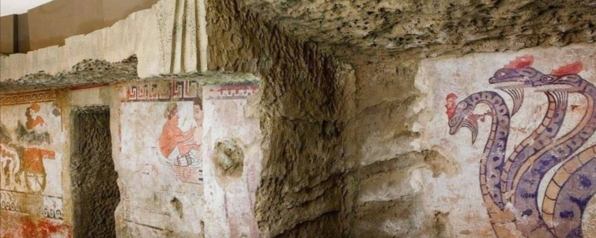 В 2003 году в окрестностях Сартеано, Италия, был найден стенной рисунок, который относится к гробнице, датируемой серединой IV века до нашей эры. Эта гробница славится хорошо сохранившимися изображениями, связанными с мифологией этрусков и их представлениями о загробной жизни. Одним из таких изображений является «Змей Горыныч», который также часто встречается на керамике из Орвието, одного из ключевых центров этрусской цивилизации. Считается, что «Змей Горыныч» символизирует одно из существ, с которыми сталкиваются души умерших на своем пути в мир мертвых.