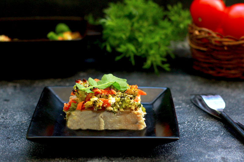 На 4 порции: ✔ Филе минтая – 600 г; ✔ Морковь – 100 г; ✔ Брокколи – 100 г; ✔ Соль – по вкусу; ✔ Белый перец – по вкусу; ✔ Йогурт греческий/творожок мягкий – 3 ст. л. Филе минтая наполовину разморозить и разрезать на 8 порционных квадратов толщиной 1-2 см. Приправить солью и немного белым лимонным перцем, можно сбрызнуть лимонным соком по желанию. Морковь крупно натереть или нарезать небольшими брусочками. Соцветия брокколи нарубить ножом по размеру моркови. Минтай выложить в форму для запекания. Разогреть сковороду, влить немного воды, выложить натертую морковь и тушить под крышкой около 5 минут без масла. Добавить брокколи, подсолить, по необходимости добавить еще воды, тушить около 7 минут вместе с морковью под крышкой. Добавить 3 ст. л мягкого творожка из банки жирностью 0.1% или греческого йогурта жирностью 2 %. Выложить протушенные овощи с йогуртом поверх минтая, разровнять. Запекать при 180 С примерно 25 минут. Подавать порционно. Минтай можно заменить хеком, пикшей, окунем, ка