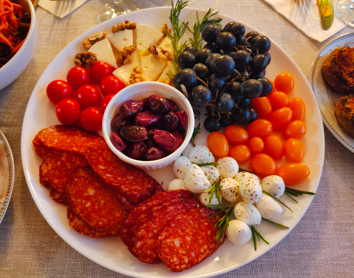 Привет, друзья! 🙋♀️ Тематические меню - это всегда необычно и интересно. Сегодня будет пример нашего праздничного стола в итальянском стиле 🇮🇹 Почему именно в итальянском? Во-первых, потому что в гостях у нас молодёжь, и такая кухня нравится им больше, чем привычные российские блюда. Во-вторых, совсем скоро Новый год, и все мы ещё успеем насладиться русскими традиционными угощениями. Итак, приятного просмотра 😊 Перед основным блюдом подаются "антипасти", то есть закуски. Блюдо "антипасто" Состав: колбаса Пеперони, шарики сыра моцарелла, помидоры черри оранжевые и красные, виноград, сыр камамбер, вяленые оливки каламата в оливковом масле со специями, розмарин и орехи для украшения; Салат "антипасто" Состав: помидоры черри, консервированный тунец, красный лук, фасоль белая, шпинат, базилик, оливки, каперсы, заправка - масло оливковое, лимонный сок и цедра, соль, свежемолотый перец; Запечённые фаршированные шампиньоны Начинка: измельчённые жареные с луком ножки шампиньонов, т