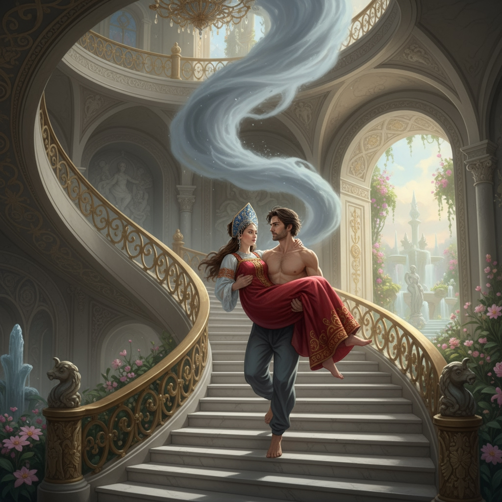 — Да! — даже не задумавшись воскликнул кокошник. И мне показалось, что он попытался меня задержать, во всяком случае на голове потяжелело. На следующем пролёте клубился какой-то странный туман, плотный он периодически вырывался серыми лентами, как будто хотел завоевать себя больше пространства. Кокошник затих, когда я стала, медленно придерживаясь за перилла, пониматься вверх к туману. И, когда я уже почти дошла, вдруг ступени под моими ногами провалились и я … бы рухнула вниз, но мне каким-то чудом удалось зацепиться за стойку перил. Висела я так, болтаясь над пропастью, и думала: «Вот ведь умница. Не могла в спальне посидеть до ужина, книжку почитать. Нет, полезла приключения искать». С неимоверным усилием я всё-таки втащила себя обратно на лестничную клетку