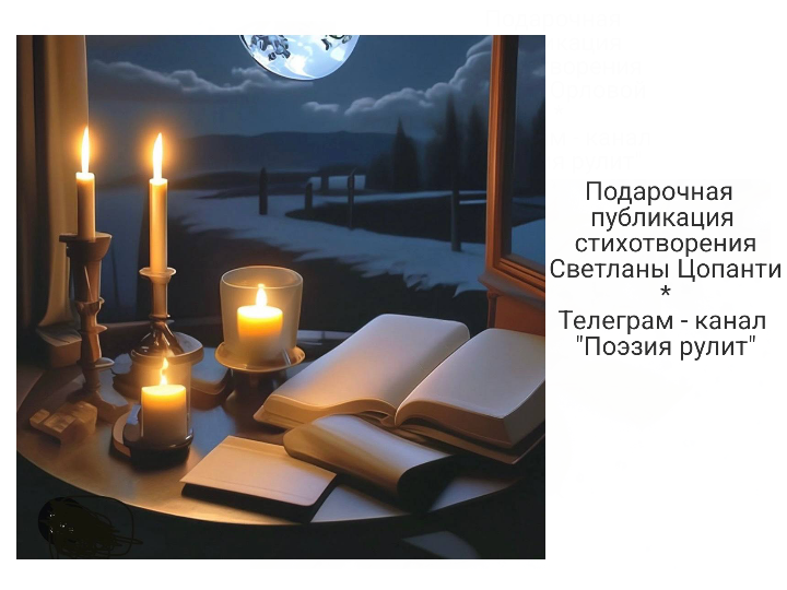 Ночной этюд Всё затихло. Оконный прозрачный квадрат Озарён млечным светом, как исповедь Бога. Ночь плывёт, как скрипач, осторожно и гладко, По струне поднебесья от слога к порогу. На столе полусонный лежит черновик, Пахнет воском, чернилами, далью и светом. Словно кто-то включил , настольный ночник, И серебряный лучик играется с ветром Занавеска дрожит , будто вздох, как намёк. Профиль тени скользит, как забытая сцена. Закружился по стенам упал в уголок, И застыл как в петле черно-белого плена, И строка заскользила, как лунная нить, Между вздохом и словом, мечтою и тенью. Всё затихло. Осталось дышать и светить, Как чернильная искра в прозрачном мгновеньи. ~ Автор: Светлана Цопанти 19.06.25. https://t.me/svetiksvetlana01 ~ Подарочная публикация стихотворения от Телеграм канала - Поэзия рулит #стихи #поэты #поэзиярулит