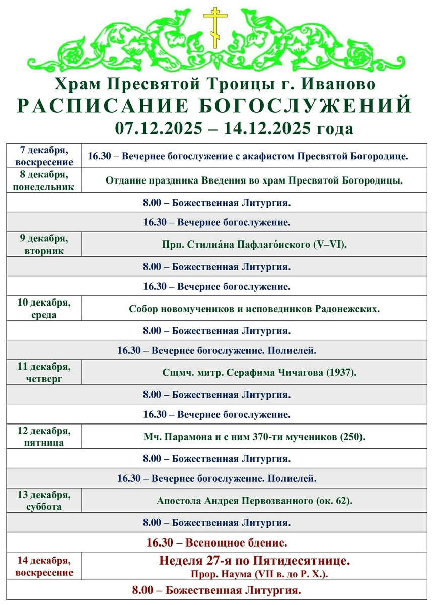 07-14.12. Расписание богослужений в Троицком храме г. Иваново
