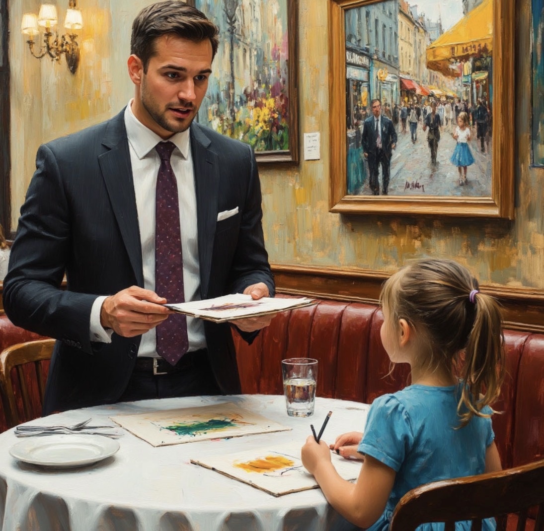 За несколько недель ресторан действительно превратился в маленькую галерею. На стенах висели детские рисунки: дома, деревья, собаки, мечты. Люди сначала удивлялись, потом улыбались, а некоторые даже покупали работы.