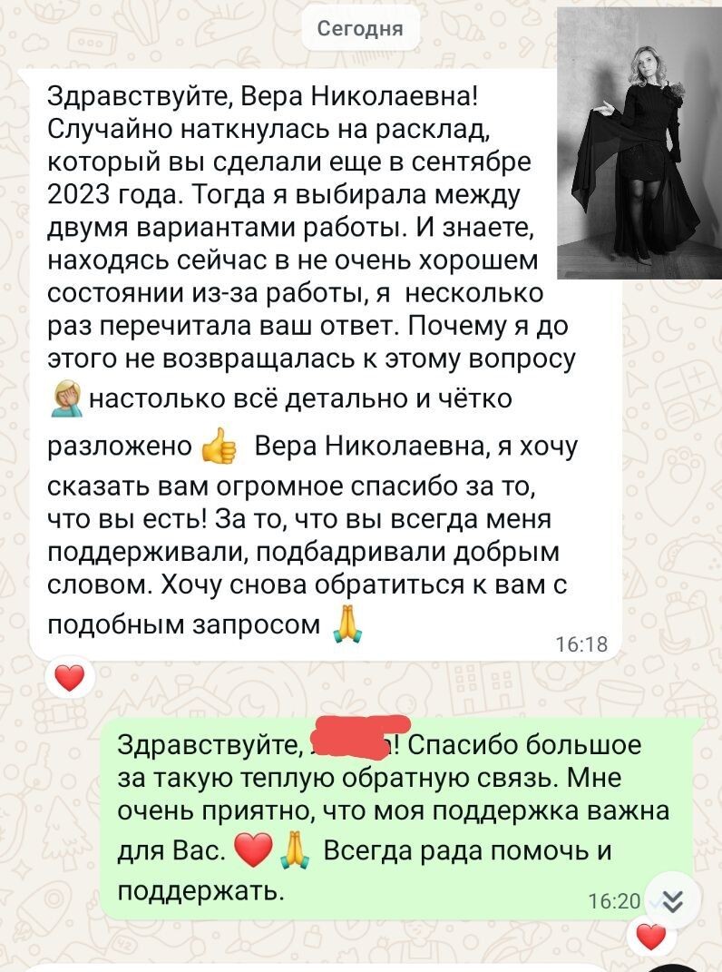 Всем привет! Всем здравствуйте! Я давно не напоминала о себе, не рассказывала о своей деятельности, но сегодня появился повод, поделиться новостью для меня приятной. Я получила обратную связь о своей работе и мне захотелось поделиться с вами. Вдруг, кто- то думает обратиться и сомневается в выборе специалиста. Напоминаю о том, что я психолог с высшим образованием, помимо диплома имею различное количество пройденных курсов повышения квалификации по психологии, косметологии и актерскому мастерству. В связи с тем , что люди часто обращаются за советами к древним инструментам и традициям, я изучила Таро и Руны. Мой опыт показывает, что любые метафорические карты работают одинаково. Не важно, это знаки Таро или любая другая современная колода, которые используют в коучинге. Важно, чтобы колода была в руках специалиста, который умеет считывать информацию и который на одной волне с Вами. За личными консультациями, сюда 89257615810. Всем добра, любви и радости! #психологВераМ