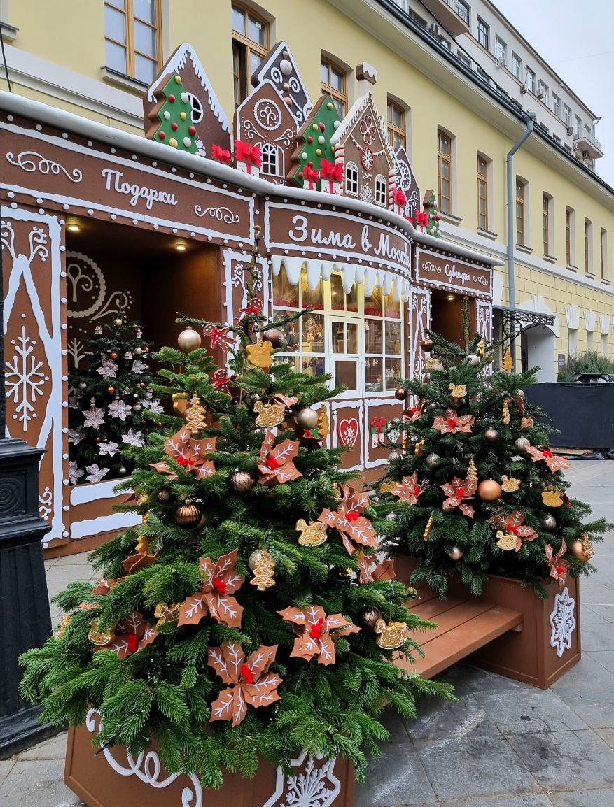 Несмотря на ранний старт подготовки к Новому году, в Москве погода стоит совсем не зимняя, снега нет, зато все декорации на месте. Может быть, так даже лучше - фотографироваться и сидеть на скамейках приятнее, когда сухо и нет привычной хлюпающей слякоти. В центре много праздничных локаций, но и людей немало, особенно в выходные. Я, как всегда, щелкаю на бегу по дороге на работу Камергерский переулок. Хотя его впору переименовать в Пряничный. Наверняка в интернете будет множество классных профессиональных снимков, меня же традиционно интересуют растения. Если сравнивать с прошлым годом, то, кажется, стало меньше сосен. Помню, как к весне они уже стояли сухие. Понятно, что растения в комах просто помещены в контейнеры и присыпаны щепой, а не посажены в грунт. Сосны-крупномеры на Камергерском остались здесь с лета, их украсили шарами и шишками. Все остальное - новое. В большинстве своем - пихты, но есть и неожиданные для Москвы растения, например, падуб. Обратите внимание на арку. Д