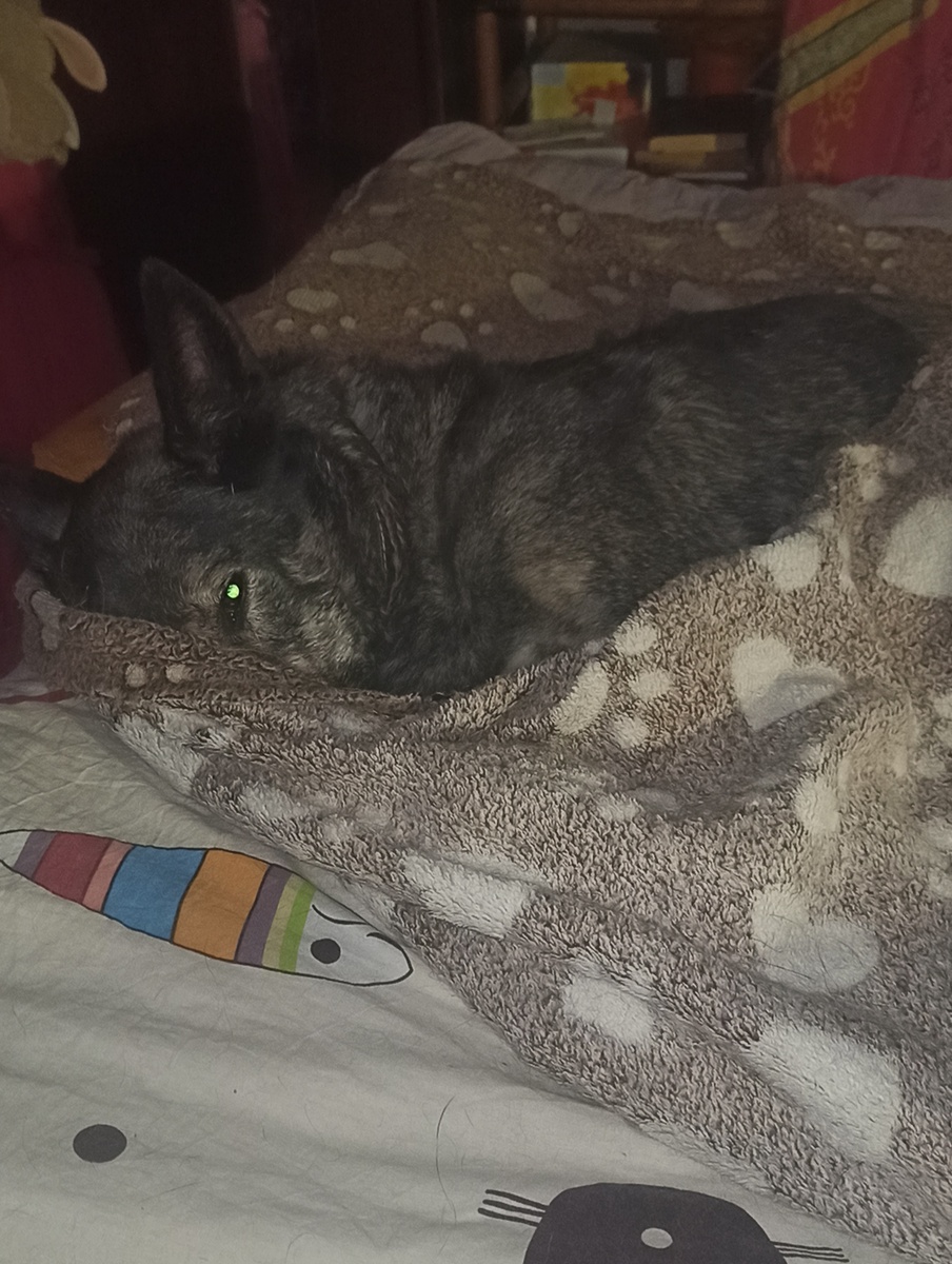 Твоё лицо, когда ты вышла погулять, на улице встретила лучшего другана хаски Юлика, поскакала с ним немножко, пришла домой, помылась, хорошо отужинала, а потом мама ещё дала косточку мозговую говяжью на десерт! А собаке Шервуду не дала, ха-ха-ха! Ему кости нельзя, ему от них плохо. А ты собака Дусяка и тебе - хорошо...😁