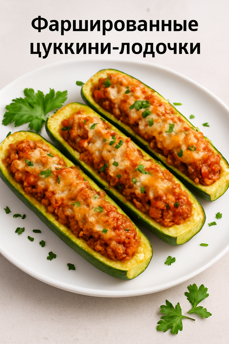 Если вы ищете блюдо, которое одновременно выглядит празднично, готовится легко и нравится всем без исключения — фаршированные цуккини-лодочки станут вашим фаворитом. Это идеальная горячая закуска или лёгкое основное блюдо, которое украсит любой стол — от тихого семейного ужина до праздничного застолья. ⭐ Лайфхак Чтобы цуккини лучше держали форму и не «раскисали», слегка отварите или запеките лодочки 10 минут до фаршировки. Они станут плотнее, и готовое блюдо будет выглядеть аккуратнее. 🥒 Ингредиенты (с калорийностью) Цуккини — 2 шт. средних (≈ 400 г, 60 ккал) Фарш (говядина/курица/смешанный) — 300 г (600 ккал) Лук репчатый — 1 шт. (80 г, 32 ккал) Морковь — 1 шт. (100 г, 35 ккал) Помидор или томатная паста — 100 г помидоров (20 ккал) или 1 ст. л. пасты (15 ккал) Растительное масло — 1 ст. л. (120 ккал) Чеснок — 1 зубчик (5 г, 7 ккал) Соль, перец — по вкусу (0 ккал) Тёртый сыр для запекания — 50 г (190 ккал) 🔥 Как приготовить 1. Подготовка цуккини Разрежьте каждый цуккини вдол